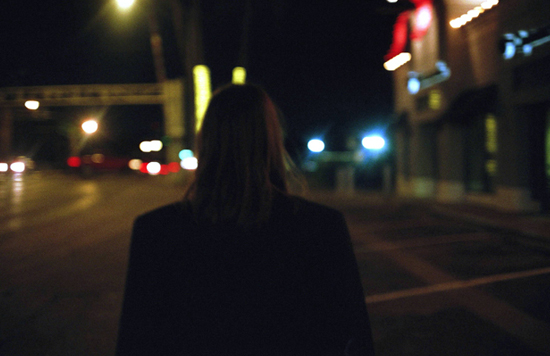 The travel starts in a city during the night.